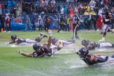 The Bears offense uses the flooded Soldier Field endzone as a slip and slide following the win